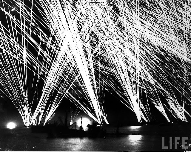 Tracer fire from many different ships lighting up the night sky over the English Channel during opening phase of D-Day, the Allied invasion of France. (no credit)